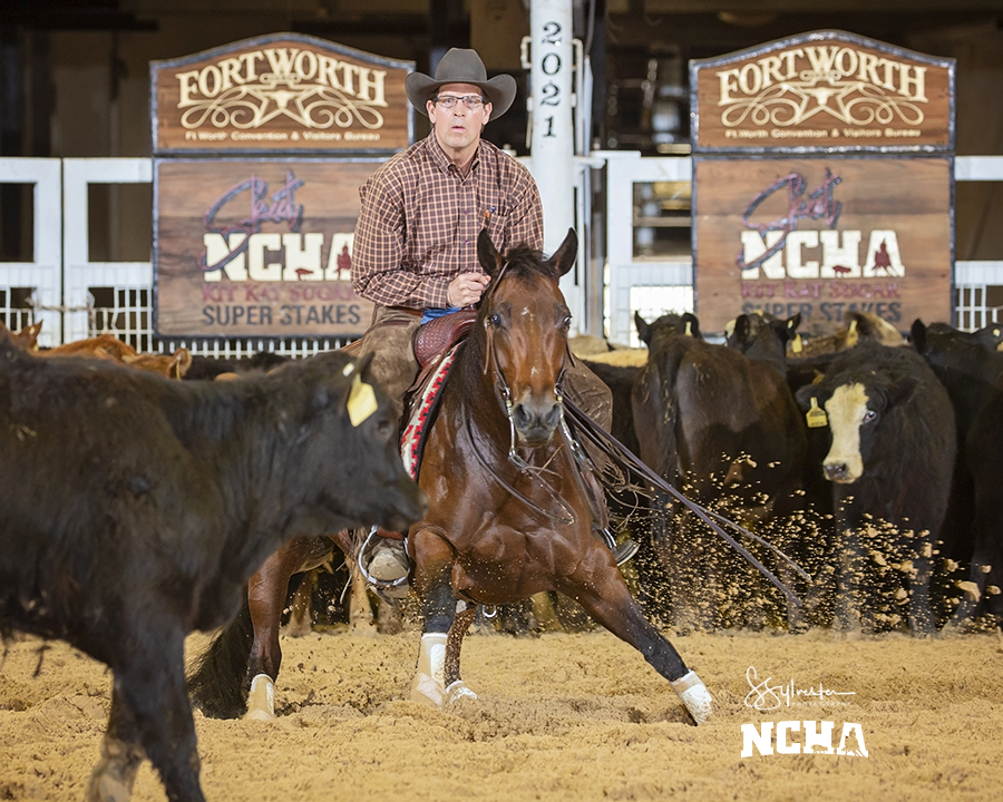 John Kratzer, Weatherford, Tex., scored 225 points on Babes Smart Cat, by WR This Cats Smart, to win $40,851 as the 2021 NCHA Kit Kat Sugar Super Stakes 5-Year-Old Non-Pro champion. Sheridan Clark, Weatherford, Tex., posted 223 points on Shorty Katz, by High Brow Cat, for $36,467 and the reserve championship, while Missy Etheridge, Corinth, Miss., scored 220.5 points aboard Boondexterous, by Once In A Blu Boon, to place third and earn $32,083.