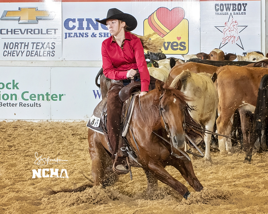 Fourteen-year-old Riley Hope Farris of Madisonville, Tex. and Baby Genius dominated the finals of the 6/7-year-old Intermediate Amateur division with a 223 at the Kit Kat Sugar NCHA Super Stakes in Fort Worth on April 14. June Roberts McGee of Granbury, Tex., on Sweet Toothe claimed the reserve championship with a 221.5, while Lindy Wells of Madisonville, Tex., was third with a 220 aboard Redhead From Denver.