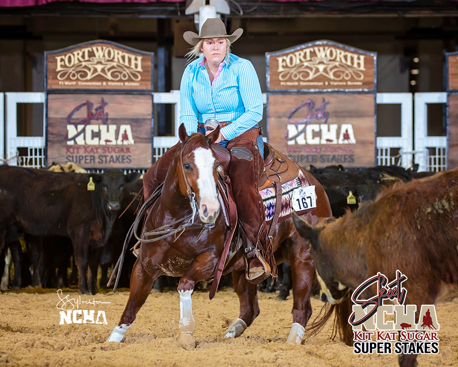 Madison data-sf-ec-immutable="" Smith of Weatherford, Tex., scored 218.5 on La Destella on Saturday, April 10 to break into the lead of the McAlister Assets 4-year-old Amateur go-round at the Kit Kat Sugar NCHA Super Stakes in Fort Worth. Three contestants on Saturday, Michelle Reichart on R Blue Cat, Lucchese Johnson on Ginger Spice and C.J. Pease on Phar Out, marked 218 on Saturday for the second high score, along with Vick Etheridge on Deputy Droopy on Friday.