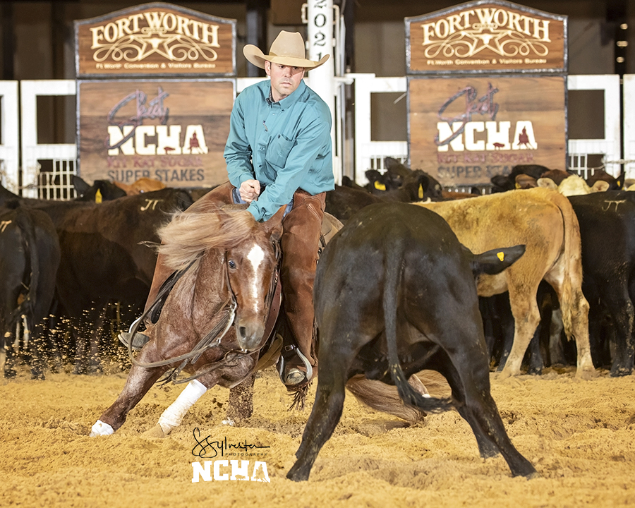Lucid Cat, by Metallic Cat, and Reyzin Amanda, by Reyzin The Cash, and The Mamba, by Metallic Cat, shown respectively by Kody Porterfield, RL Chartier and Casey Green, tied with the 221-point high score in the 2021 NCHA Kit Kat Sugar Open Semi-Finals on Monday, April 12. Overtheboonforyou, by Once In A Blu Boon, and Metabra, by Metallic Cat, tied with 220.5 points under Sean Flynn and Zeb Corvin.