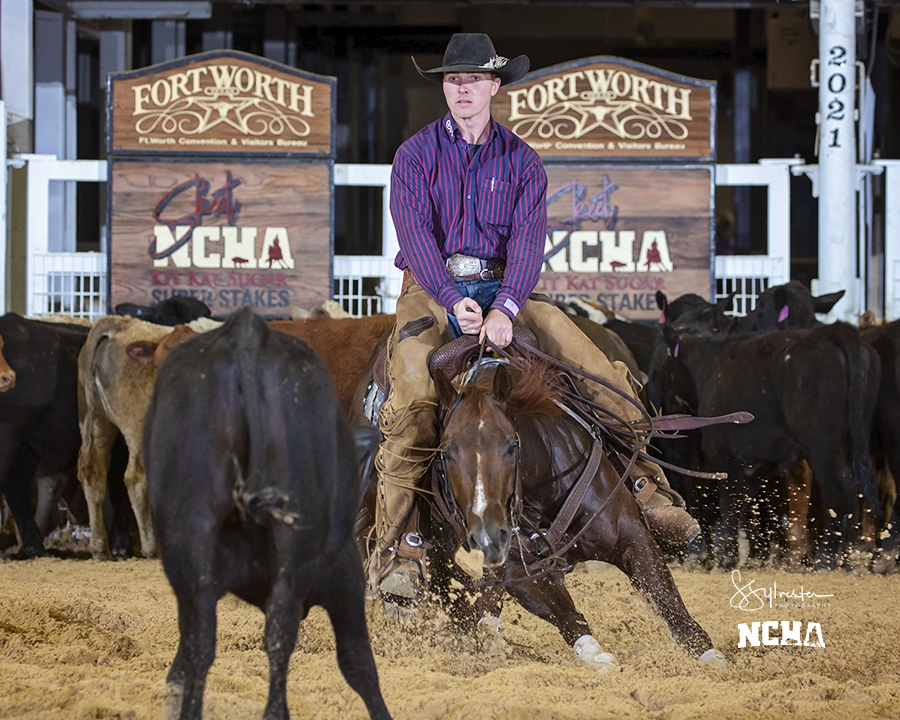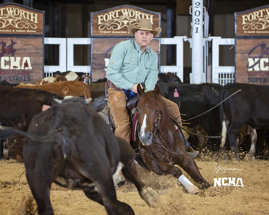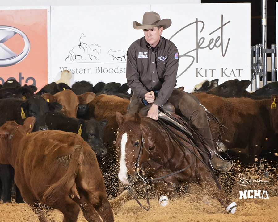 Phil Rapp set the pace with 221 points on Shes Reyl Tipsy, the second horse to the herd in the 11-horse finals of the NCHA Kit Kat Sugar Super Stakes 6/7 Intermediate Open, on Saturday, April 3. But Bear Davis, riding Rockin KW last in the field, held ground with 221 points to tie Rapp for the championship.