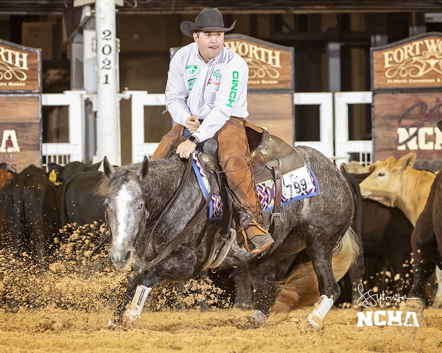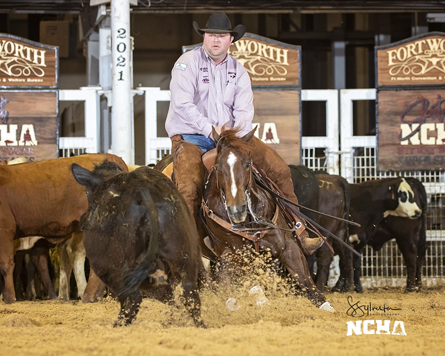Lucid Cat, by Metallic Cat, and Reyzin Amanda, by Reyzin The Cash, and The Mamba, by Metallic Cat, shown respectively by Kody Porterfield, RL Chartier and Casey Green, tied with the 221-point high score in the 2021 NCHA Kit Kat Sugar Open Semi-Finals on Monday, April 12. Overtheboonforyou, by Once In A Blu Boon, and Metabra, by Metallic Cat, tied with 220.5 points under Sean Flynn and Zeb Corvin.